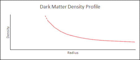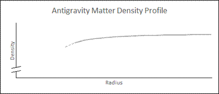 Unlike normal matter, dark matter does not appear to fall to a dense point at its centre of gravity. For example the graph on the left represents the apparent density / radius relationship of dark matter in and around galaxy cluster Abell 1689. This graph is generated in the Repulsive Dark Matter paper. According to the AGM Theory there is no dark matter. The gravity that has been attributed to dark matter is actually caused by a local reduction in the density of antigravity matter. The density of antigravity matter cannot go below zero. This sets an upper limit on the possible apparent density of dark matter. Prediction:- There is an upper limit to the apparent density of